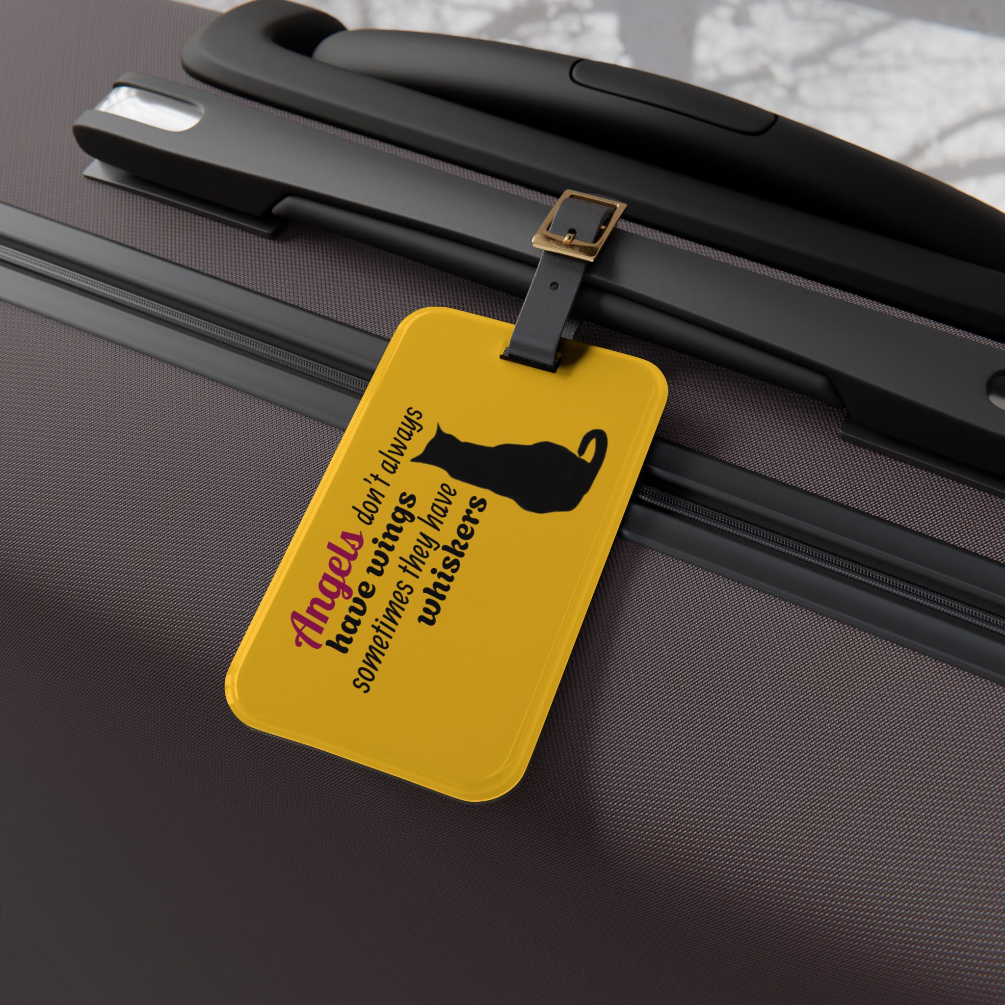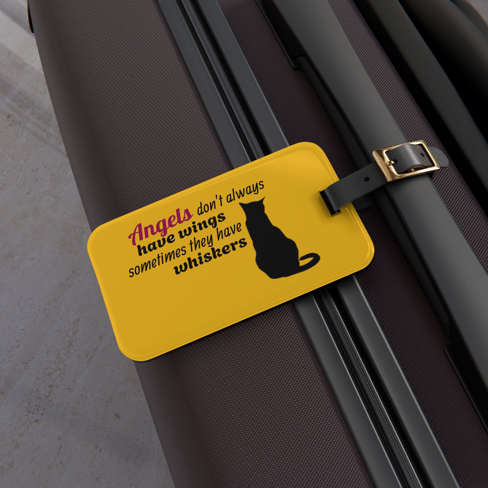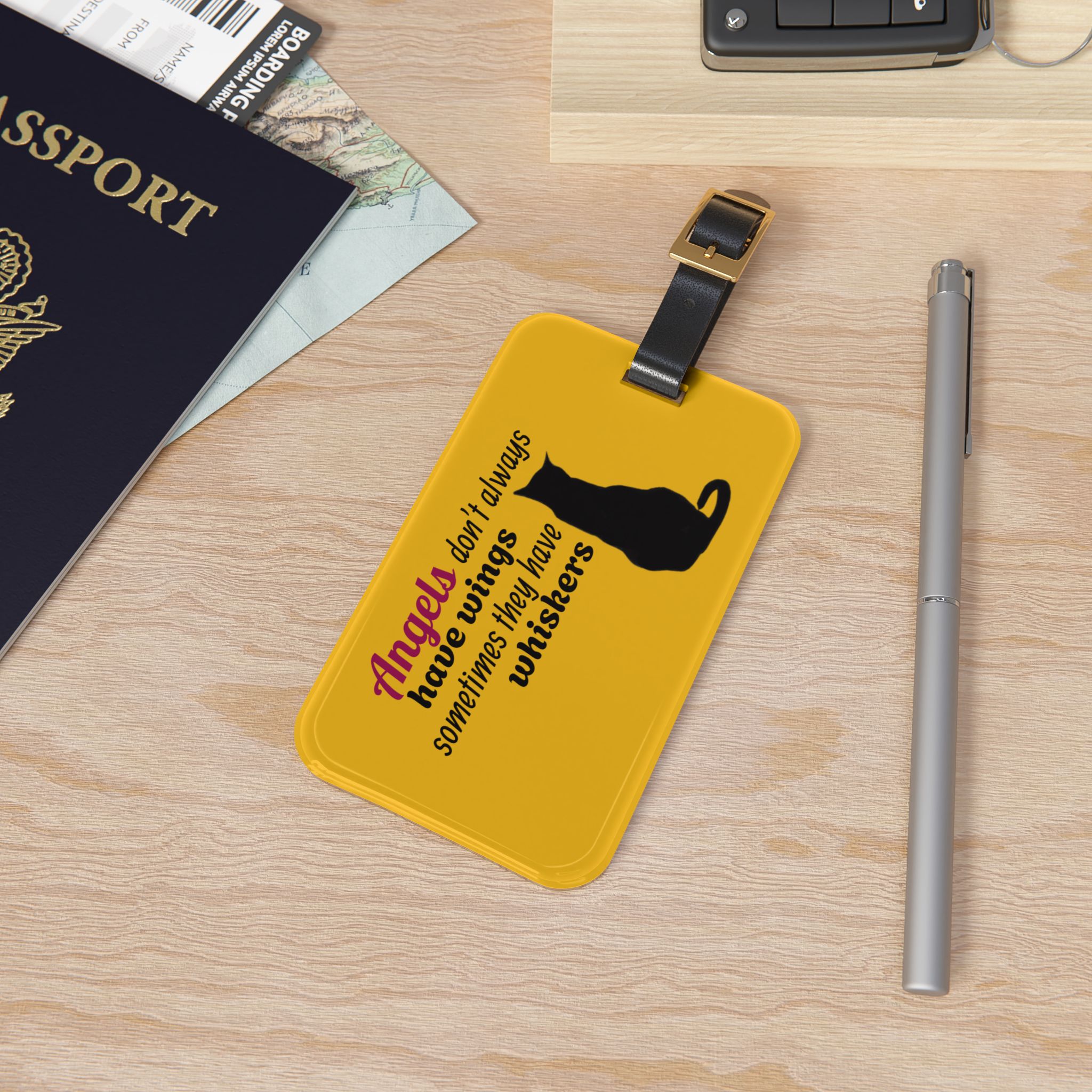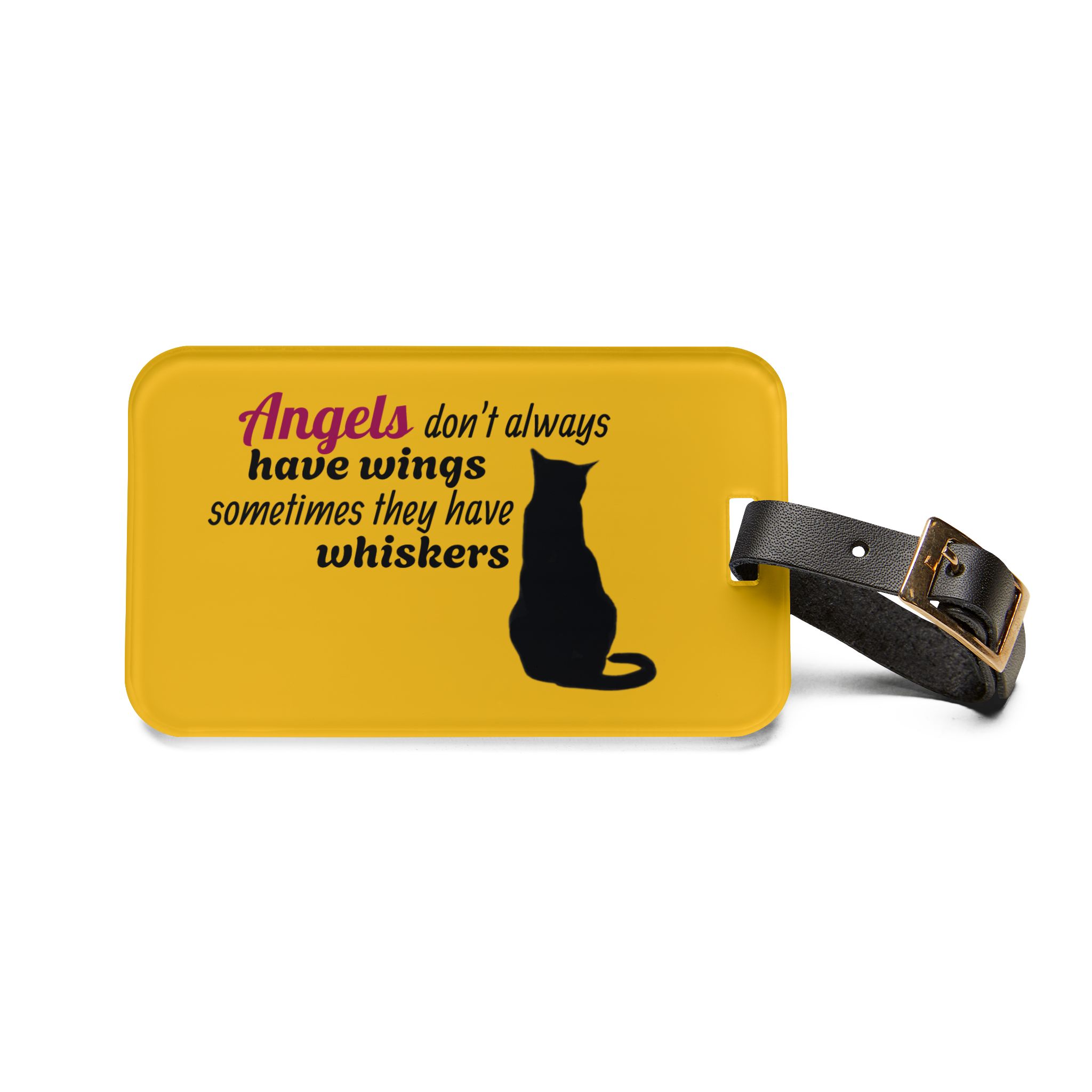 A bright, sturdy luggage tag that brings a little feline warmth to every trip. The glossy acrylic face shows a bold silhouette of a cat and the playful line “Angels don’t always have wings, sometimes they have whiskers,” printed in crisp, vibrant inks that resist fading. An adjustable black leather strap with a brass buckle keeps the tag secure on suitcases, backpacks, or carriers. Inside, a rear opening hides a card for your contact details so your bag looks tidy while staying identifiable. Lightweight and durable, this tag adds a cheerful, personal touch to journeys — a small reminder of home on the go.